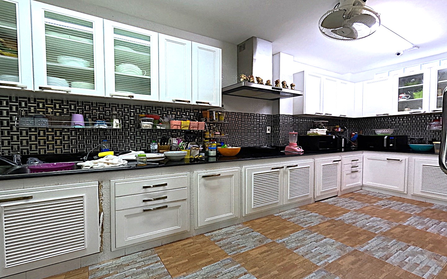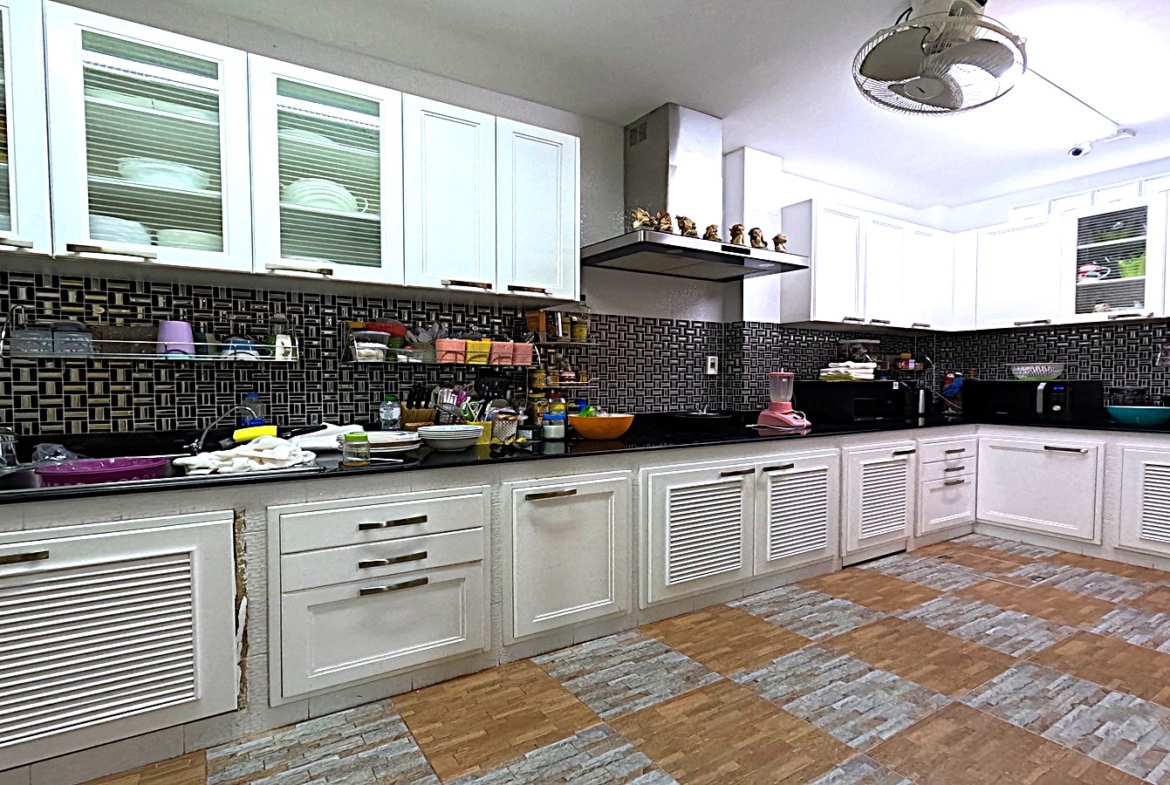 - ครัวบิ้วอินสวยหรู ปูกระเบื้องเกรดดีทั้งห้อง พร้อมเตาไฟฟ้า, Hood ดูดควัน, และตู้เก็บของบิ้วอินเต็มพื้นที่